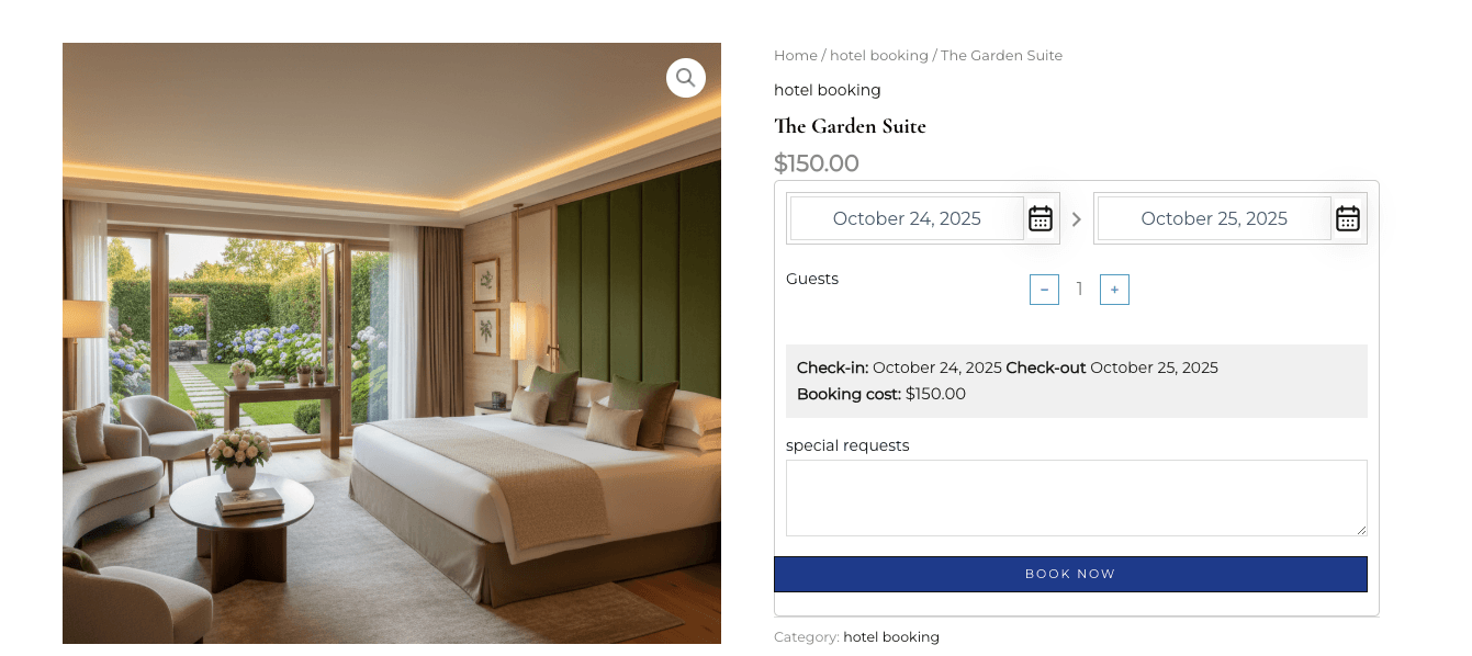 Flexible Check-in Options: Hotels can collect additional guest information before arrival either by using Booking Notes in the WooCommerce Bookings plugin or the PH Product Add-ons plugin. Guests can provide check-in preferences, special requests, or other details, reducing front desk workload and ensuring a smooth, personalized arrival experience.